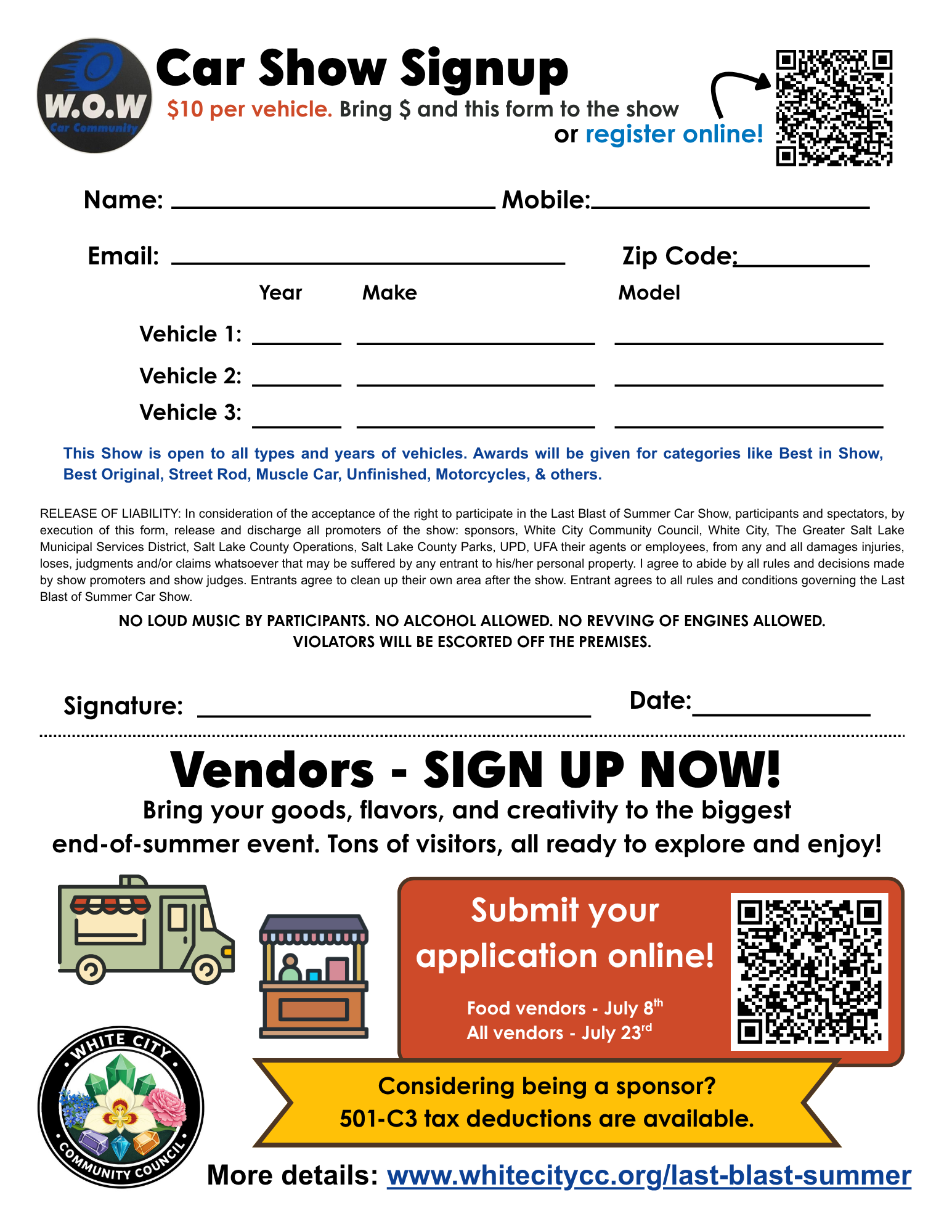 We need you! To volunteer, to be a sponsor or vendor, or if you have any general questions, you can reach us at volunteer@whitecitycc.org